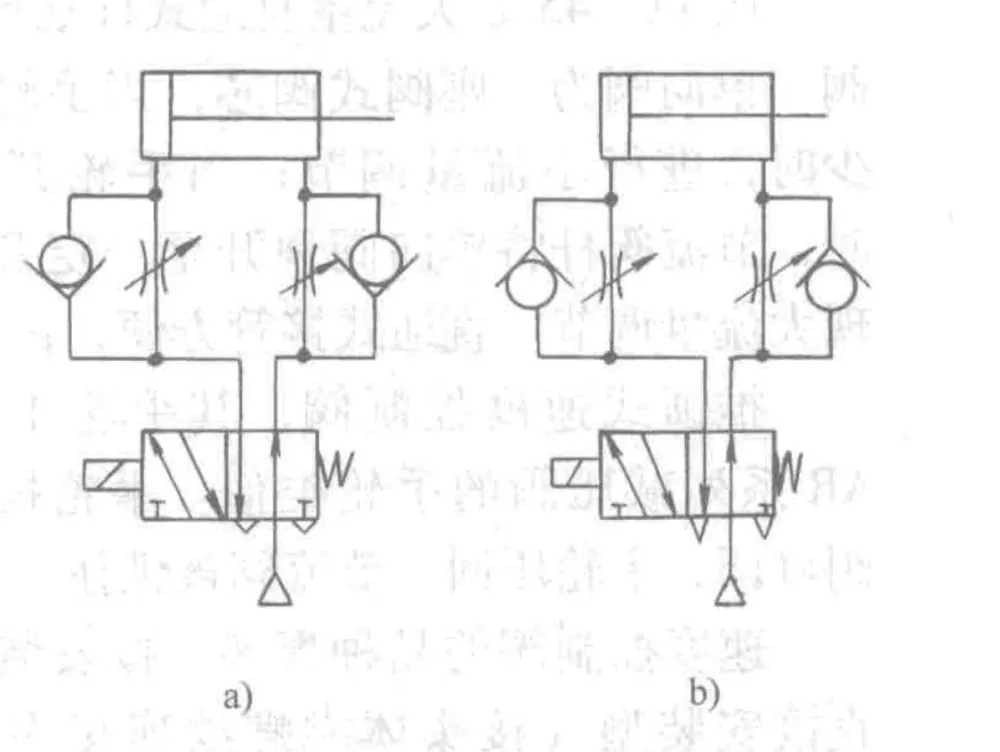 · Ing (a) (throttling exhaust), nalika katup arah dadi tenaga, katup cek ing sisih mlebu silinder mbukak, ngidini sisih rodos kanggo isi kanthi cepet. Udhara ing sisih rod mung bisa owah-owahan liwat katup throttle. Kanthi nyetel pambukaan throttle, kacepetan silinder bisa dikendhaleni. Cara iki nyedhiyakake gerakan piston stabil lan sirkuit sing paling umum digunakake.