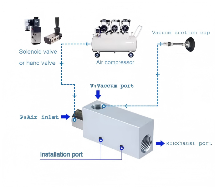 pompa vakum lan generator vakum. Pompa vakum minangka piranti mekanik sing nggawe tekanan negatif ing port nyedhot lan ngidini port exhaust bisa langsung ngliwati atmosfer, kanthi rasio tekanan dhuwur ing ujung loro kanggo ngekstrak gas. Generator vakum minangka komponen pneumatik sing nggunakake aliran udara sing dikompres kanggo mbentuk tingkat vakum tartamtu. Dibandhingake karo pompa vakum, iku nduweni struktur prasaja, volume cilik, bobot entheng, rega murah, instalasi trep, compounding gampang karo komponen ndhukung, generasi cepet lan release saka vakum, lan cocok kanggo karya intermiten karo tingkat aliran kurang, cocok kanggo nggunakake buyar.