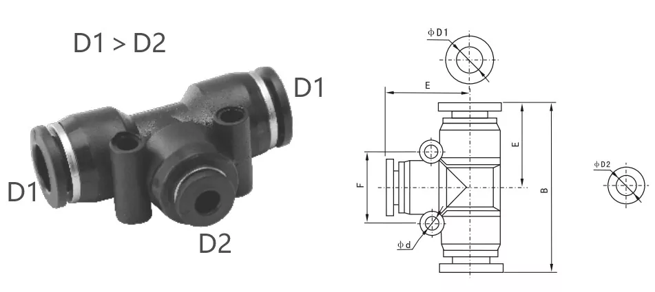 PE Pasting (Tee Tee Kesatuan): Kabeh telung tabung duwe diameter njaba sing padha, cocog kanggo nyambungake telung tabung pneumatik kanthi ukuran sing padha.
