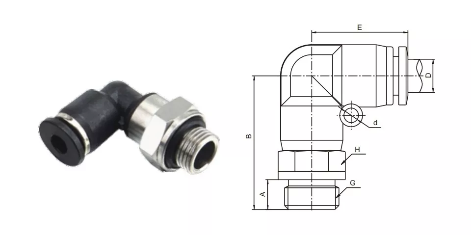 El-g sikut lanang pl-g ing pas tabung tabung yaiku konektor sikut 90 derajat lan benang sing cocog kanggo nggunakake ruang sing dibutuhake, dering tabung dibutuhake kanggo nyegah bocor hawa utawa cairan.