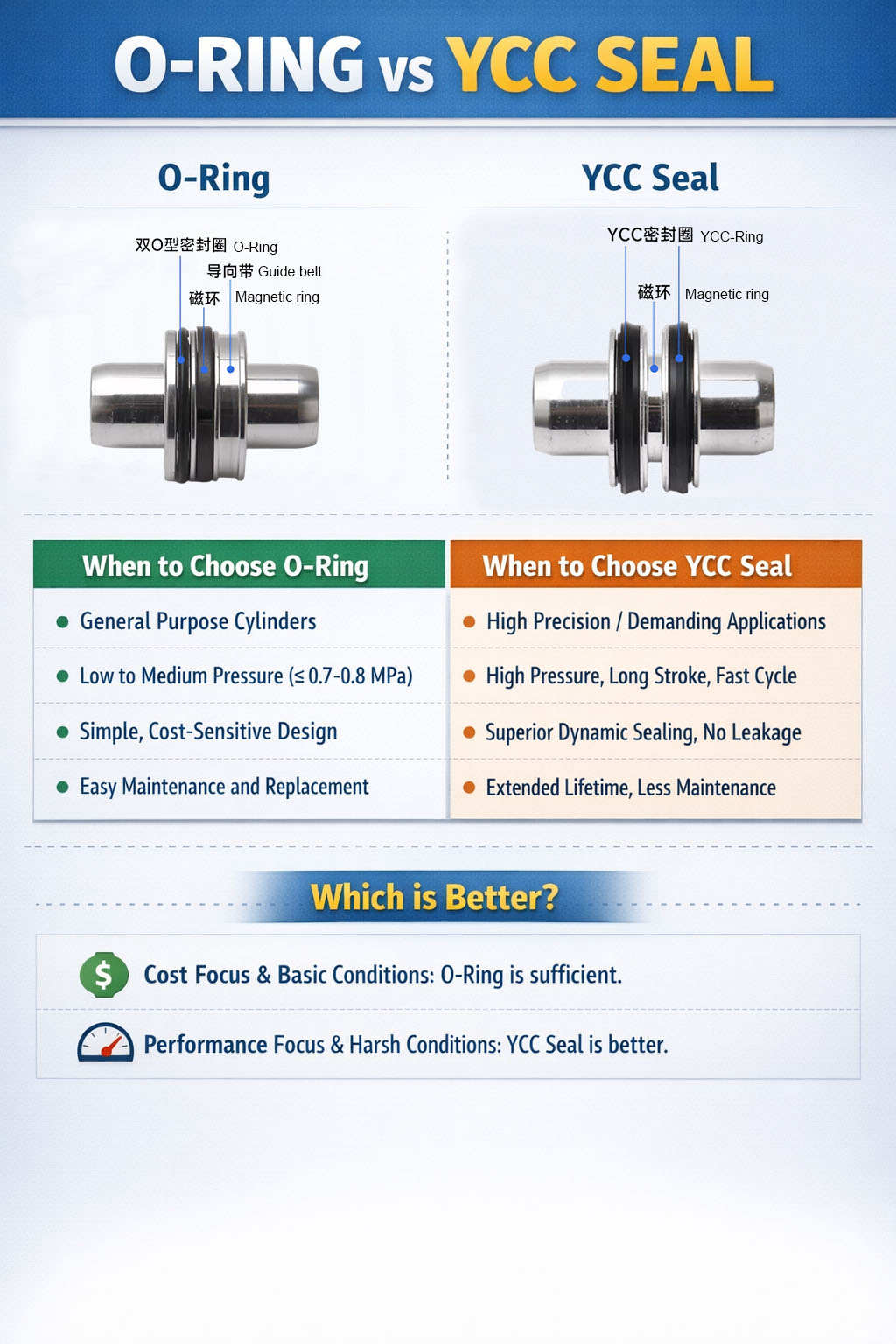 Kabeh silinder standar seri OLK SC digawe nganggo sistem sealing YCC minangka standar, dudu dering O konvensional. Iki minangka pilihan desain sing disengaja kanggo njamin kinerja sealing sing stabil, bocor sing sithik, lan umur layanan sing dawa, utamane ing operasi terus-terusan lan frekuensi dhuwur.