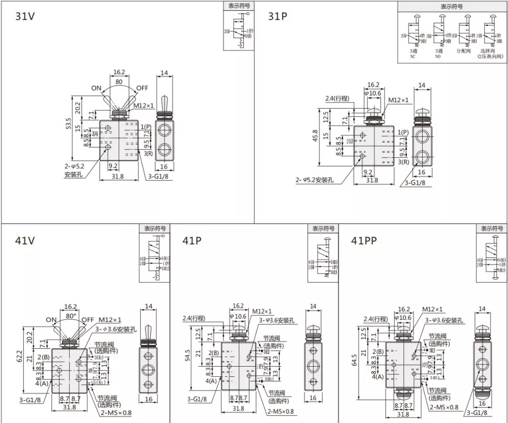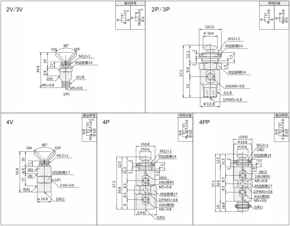 Seri TAC TACKLle katup 2 cara 2 cara, 2 posisi 3 cara lan 2 posisi 5 cara bisa milih macem-macem jinis lever lan rong jinis benang: M5, G1 / 8.